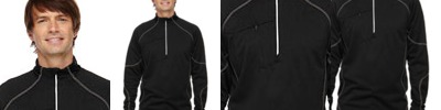 100% polyester birdseye mesh, 4.7 oz./yd2/160gsm; Moisture wicking, antimicrobial and UV protection performance; translucent zipper with contrast treading ; inside placket with chin guard; subtle contrast coverstitch details at raglan and back sleeves ; underarm gusset; decorative reflective print on left front and back;